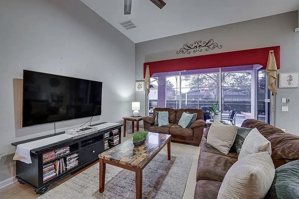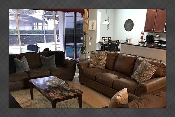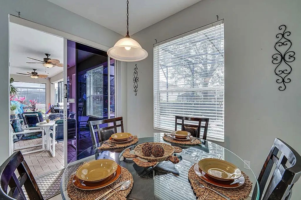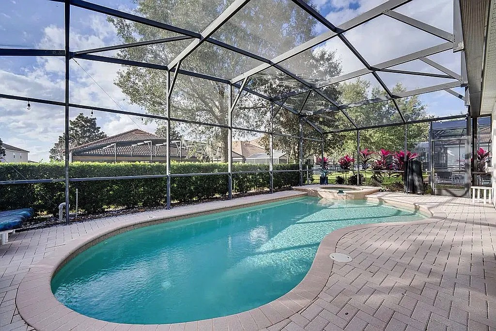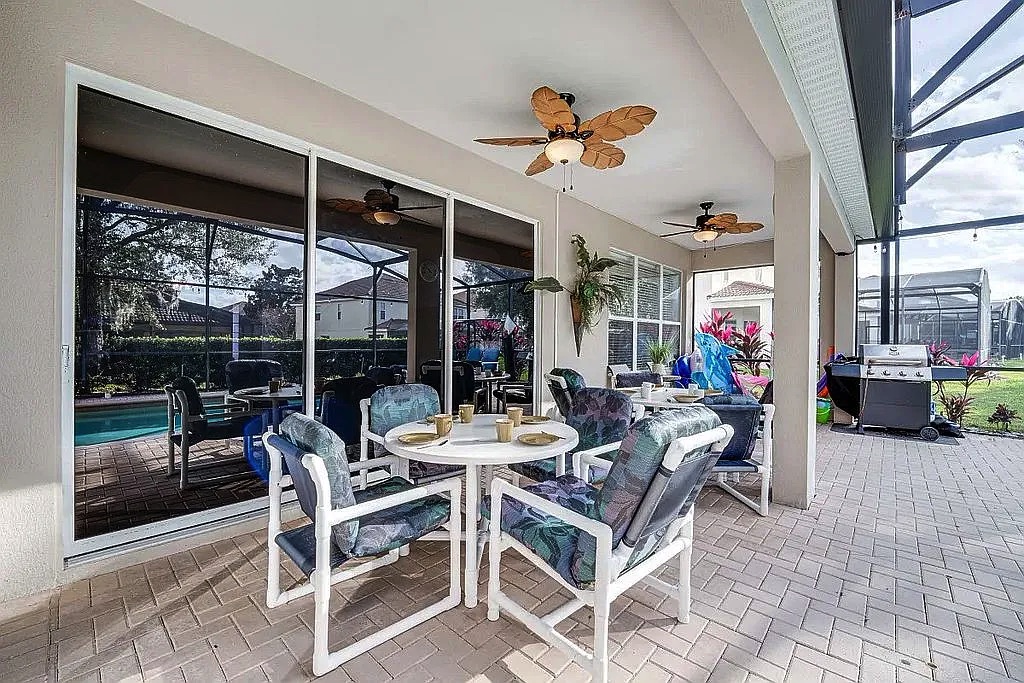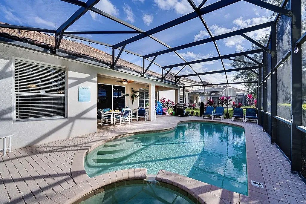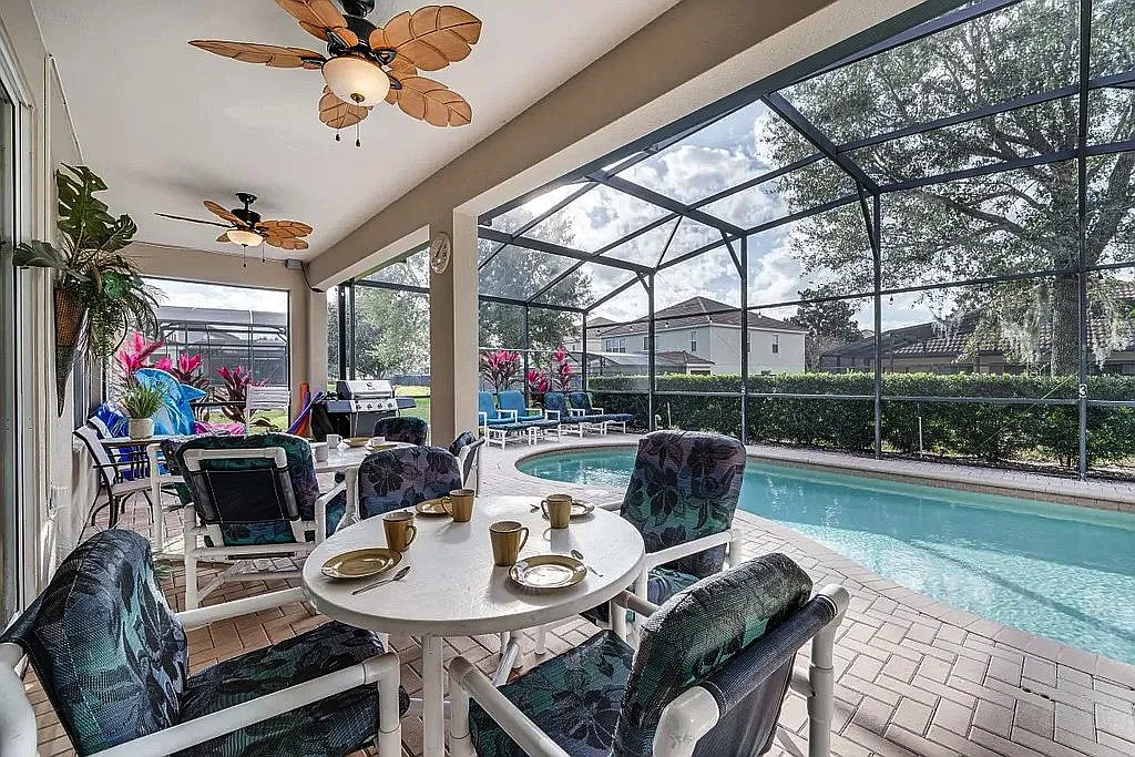 The spacious floor plan features an open living and dining area, perfect for entertaining large groups, along with a well-appointed kitchen designed for convenience and comfort. The home includes generously sized bedrooms, providing plenty of space for families and guests. Step outside to enjoy the private screened pool and patio, ideal for relaxing after a day at the parks. Wi-Fi and cable are included in HOA.