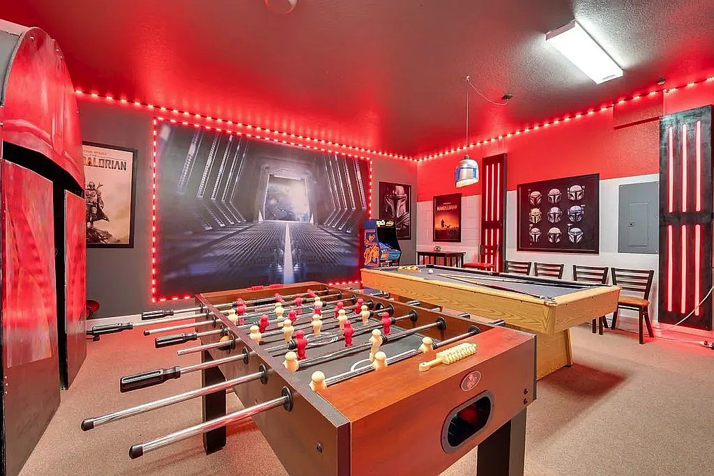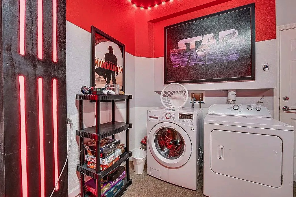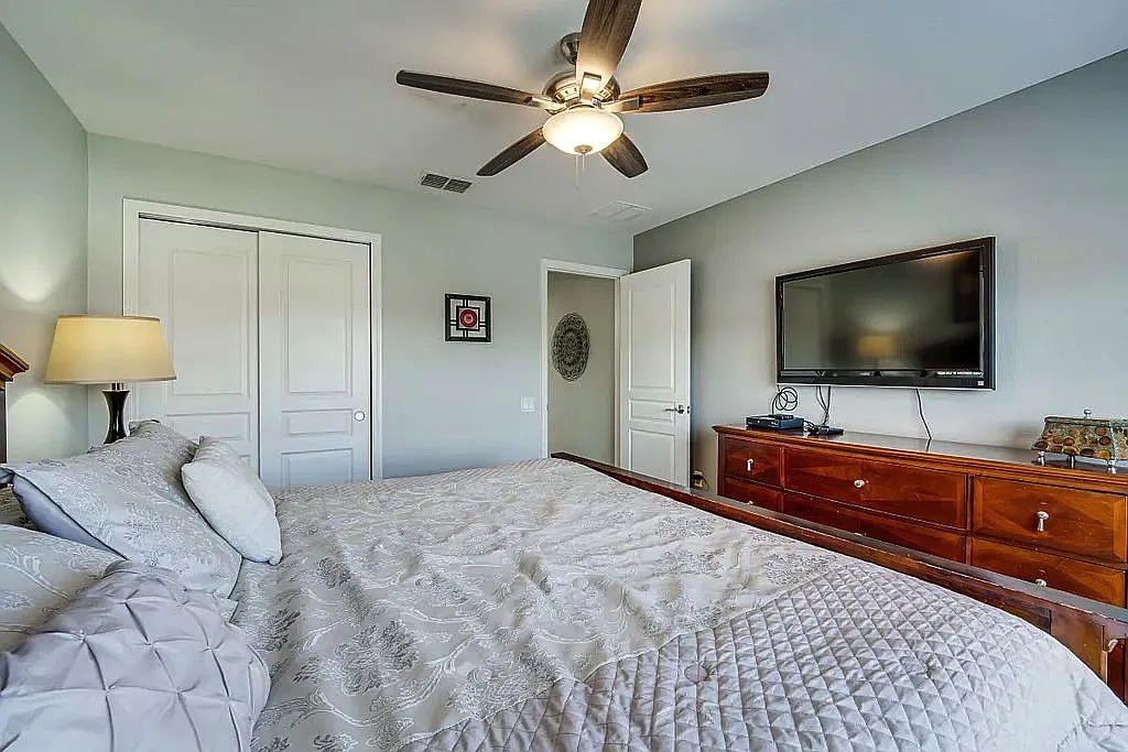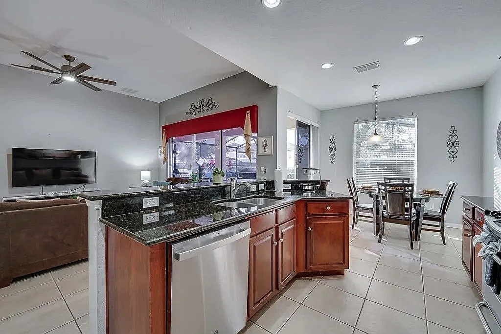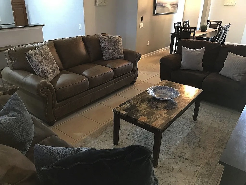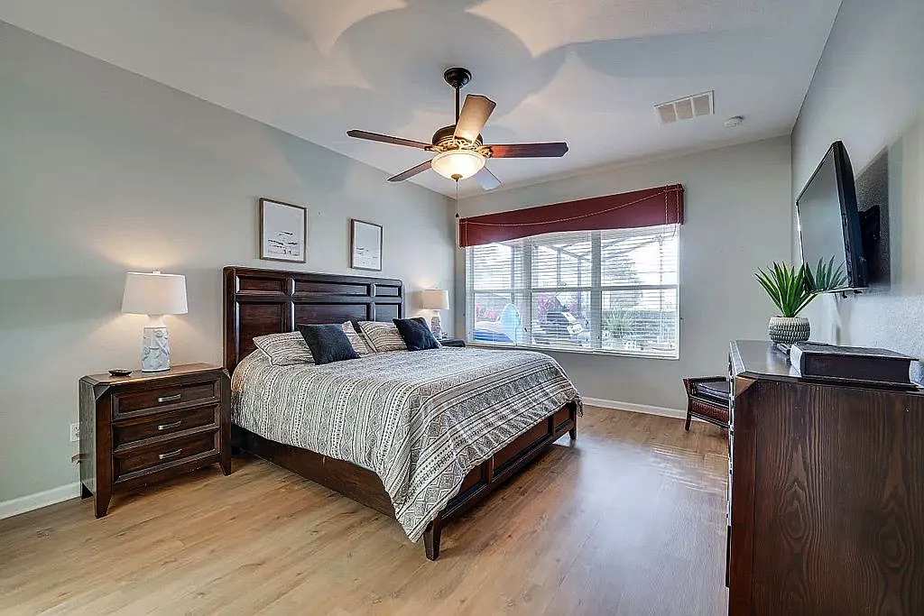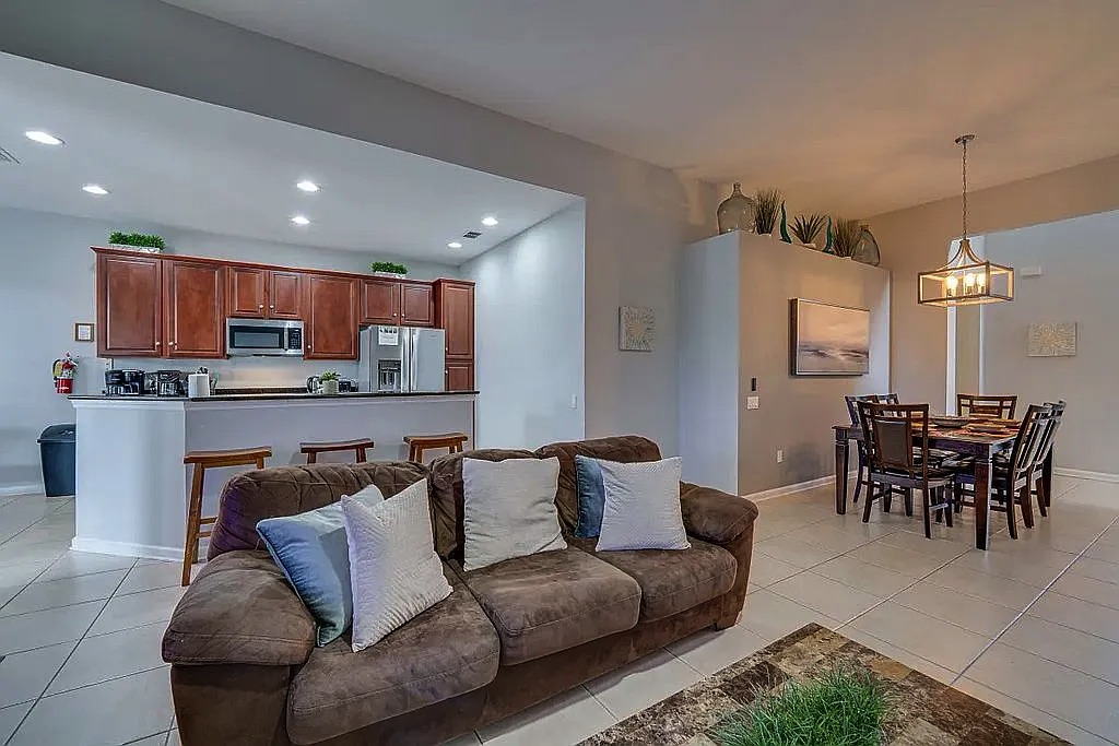 The spacious floor plan features an open living and dining area, perfect for entertaining large groups, along with a well-appointed kitchen designed for convenience and comfort. The home includes generously sized bedrooms, providing plenty of space for families and guests. Step outside to enjoy the private screened pool and patio, ideal for relaxing after a day at the parks. Wi-Fi and cable are included in HOA.